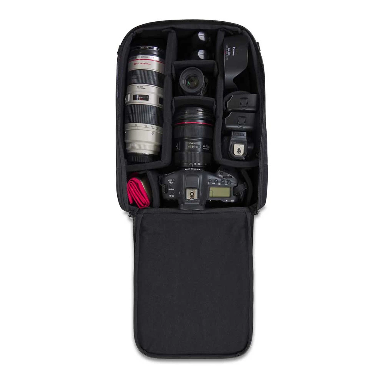 - Accommodates a camera body, spare lens, and other essentials